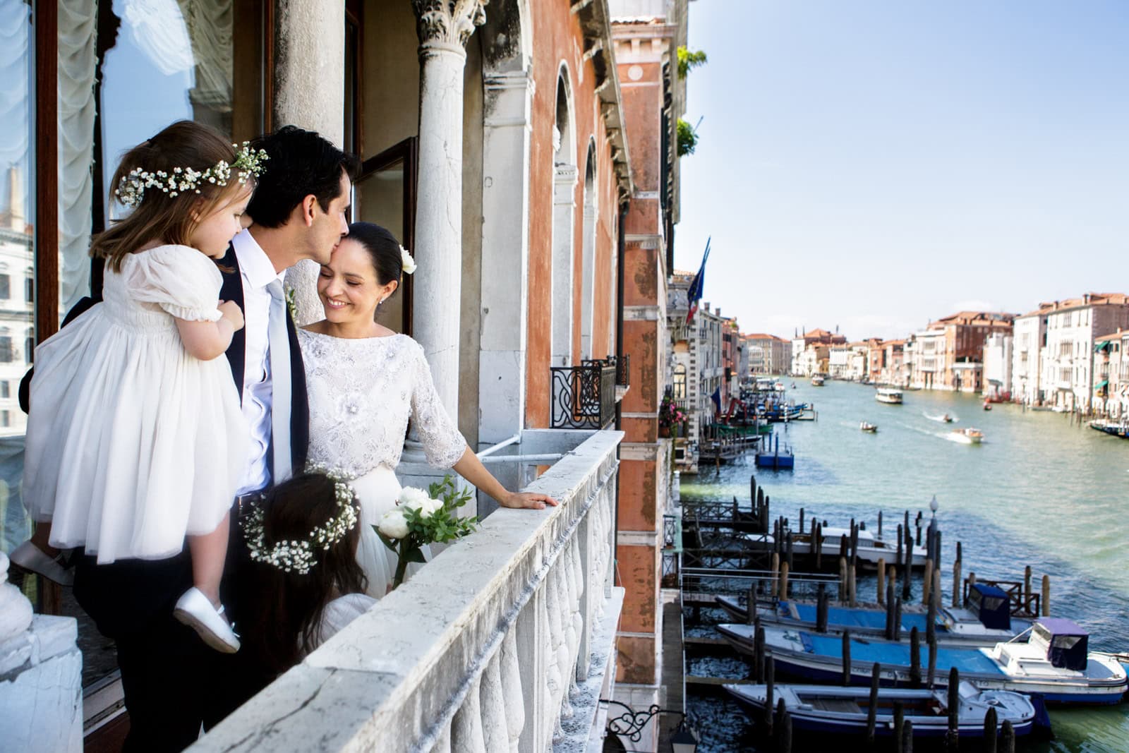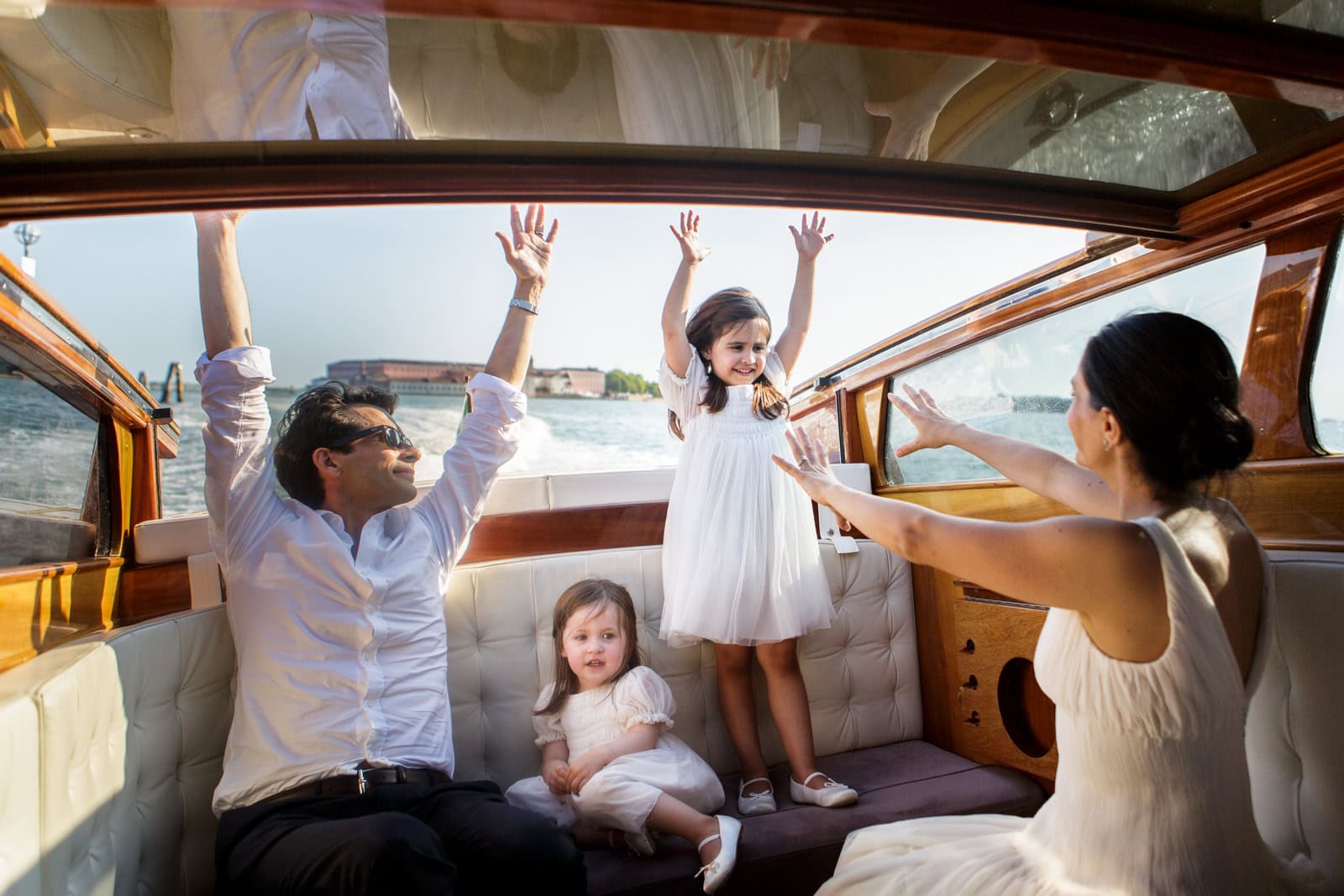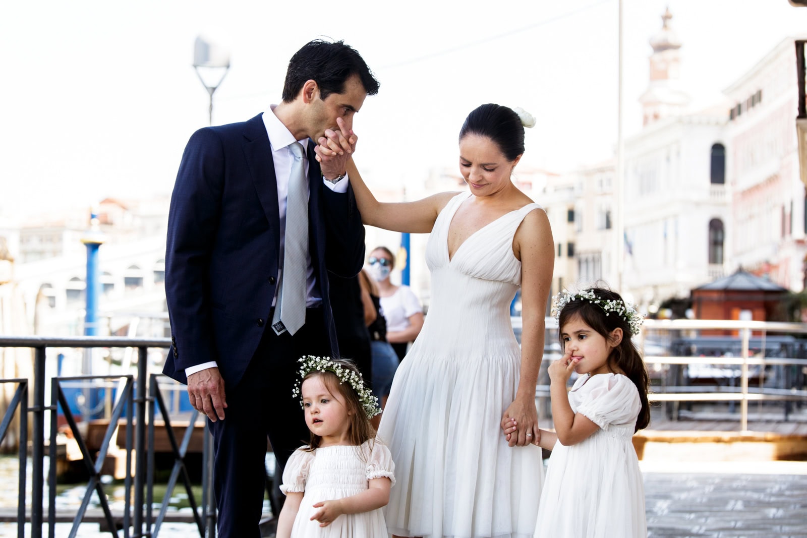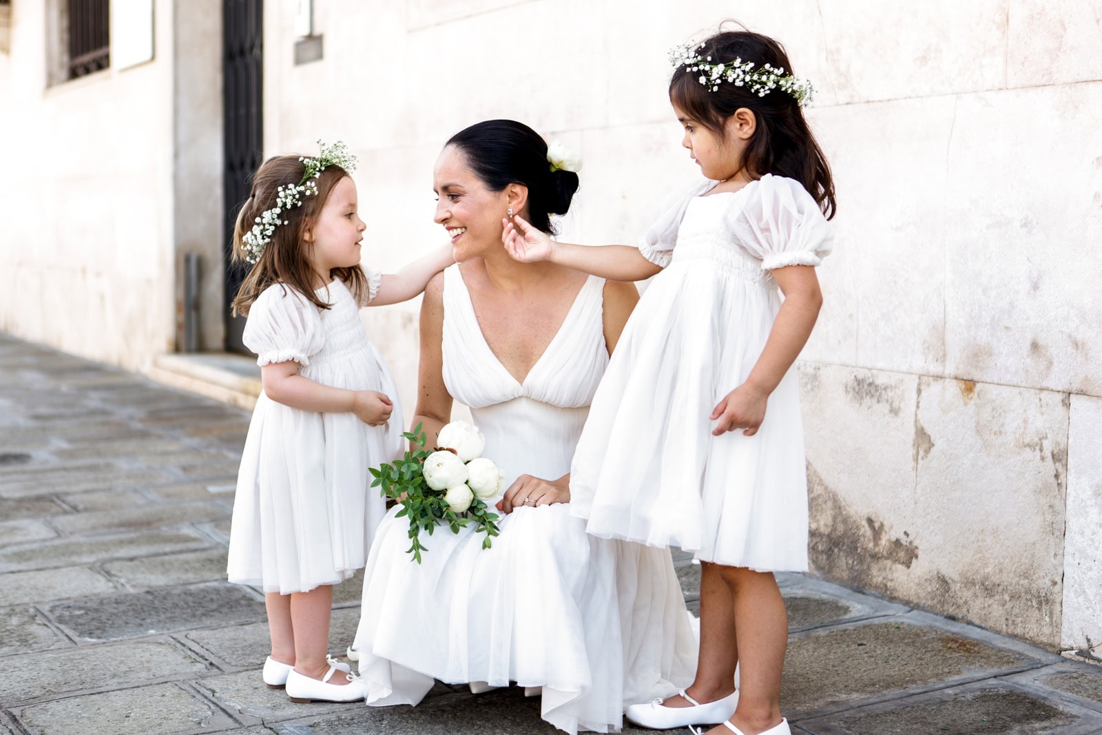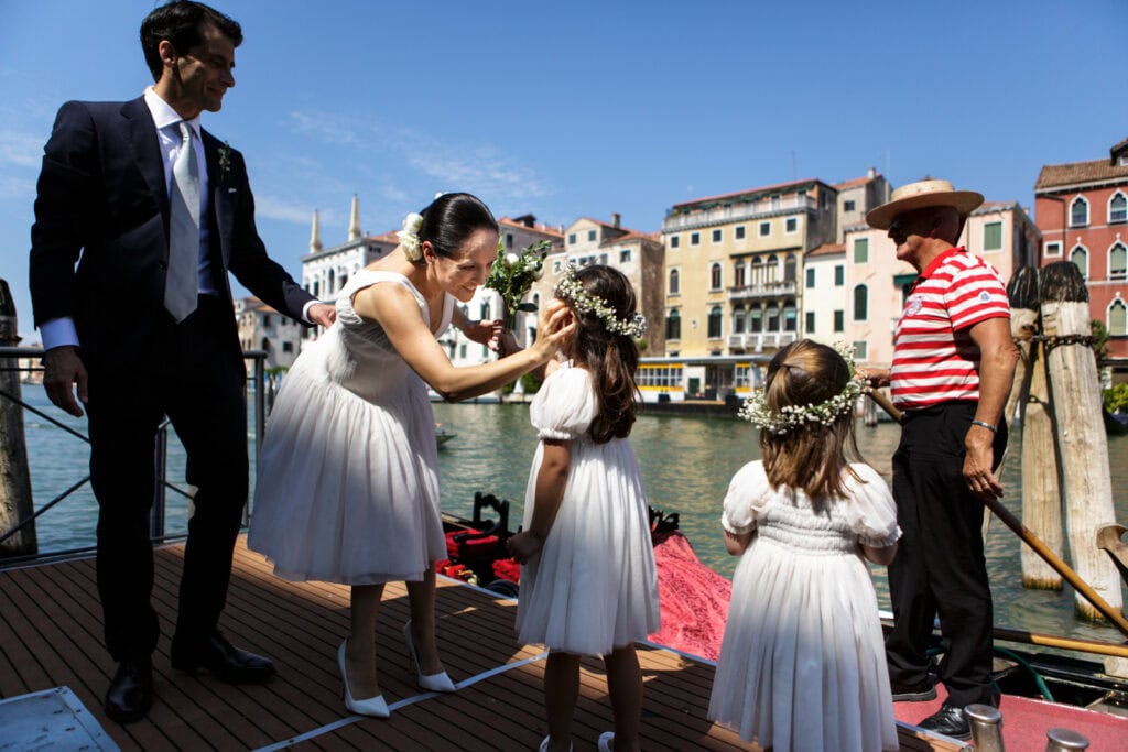 Vanessa and Marc chose to celebrate their wedding in Venice, just the two of them and their daughters — an intimate and beautifully secret day that no one else knew about. Preparations began at Palazzina Grassi, a stylish and artistic boutique hotel that perfectly matched the relaxed and modern feel of their celebration. From there, Vanessa travelled by gondola through the canals to Palazzo Cavalli, where Marc and their daughter were waiting for her. As there were no guests, I had the honour of being one of their wedding witnesses, while the guitarist who played during the ceremony acted as the second. Afterwards, they took a boat to San Clemente Palace Kempinski, a beautiful hotel set on its own private island overlooking the Venetian skyline. There, they enjoyed a quiet family picnic before we wandered through the gardens for some relaxed evening photos. It was a day full of warmth, intimacy, and emotion – simple, spontaneous, and completely their own.